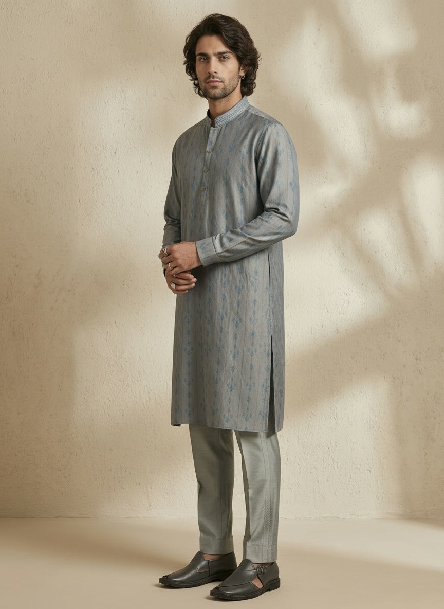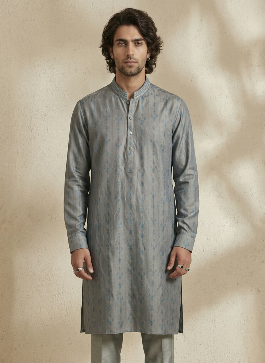 Note: This kurta includes grey straight pants. Can be requested with a churidar if required
