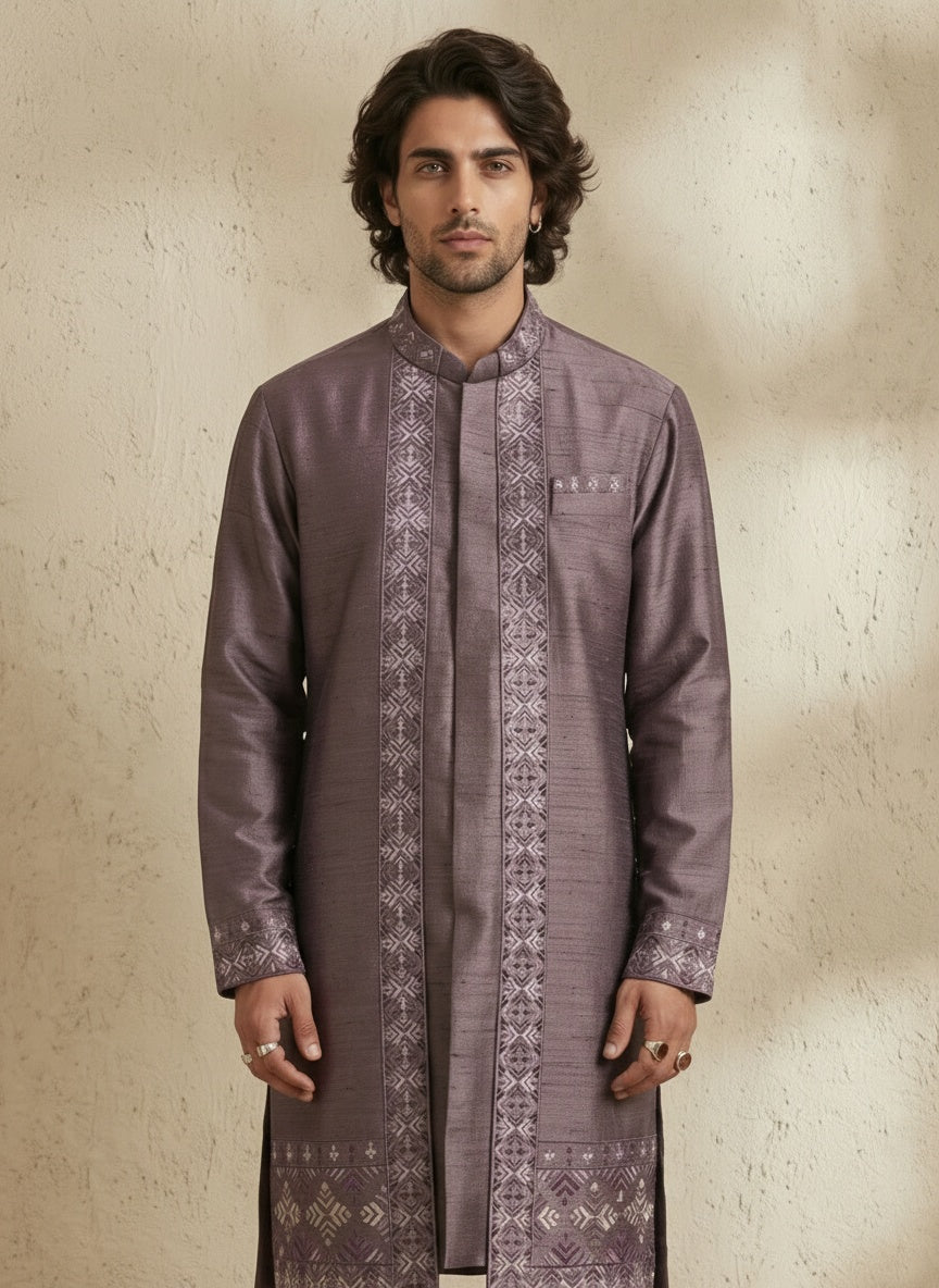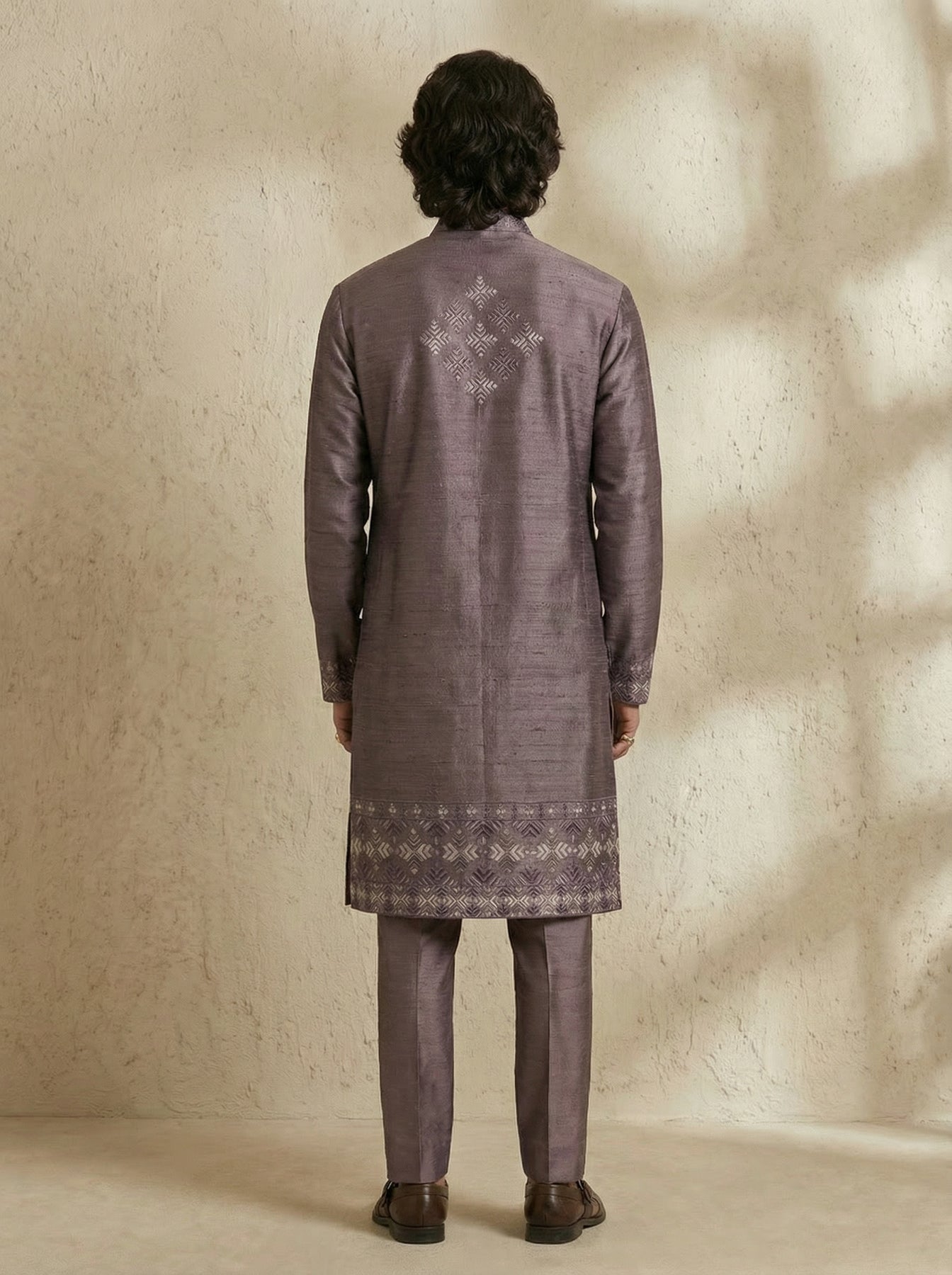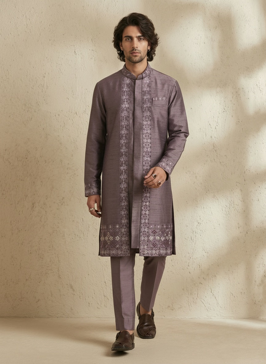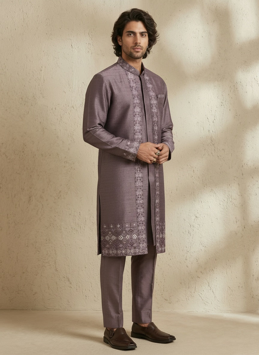 On Model: Mauve nexa embroidered kurta set