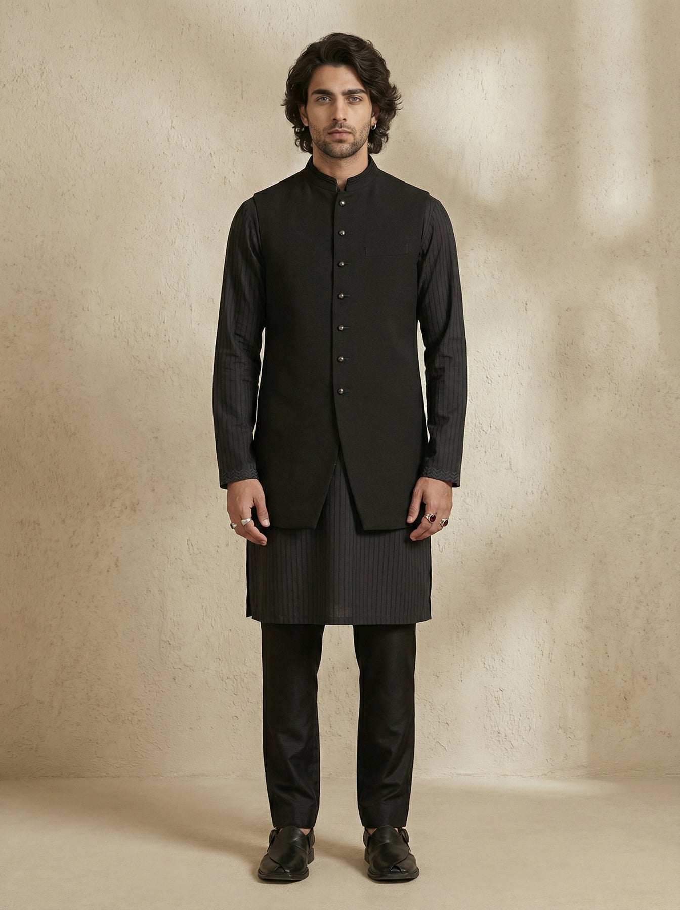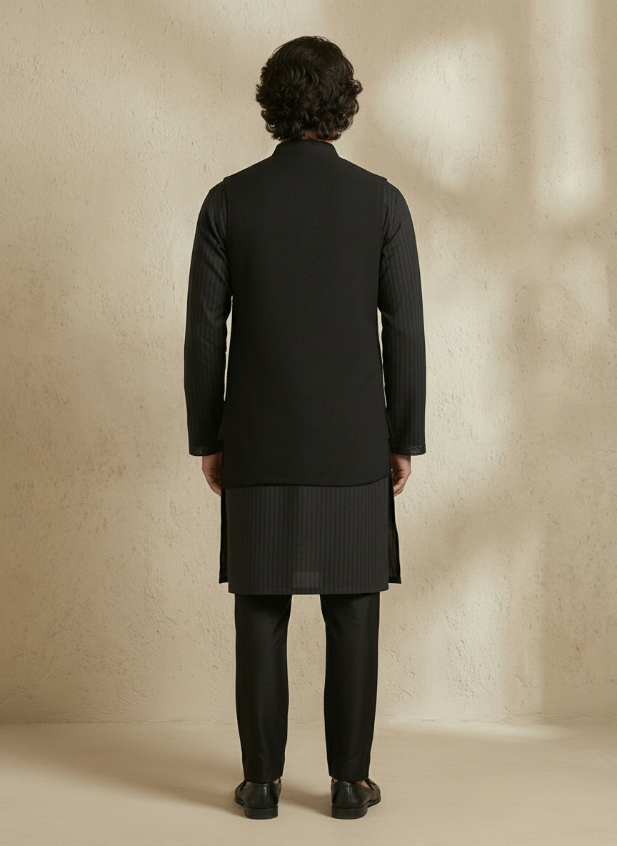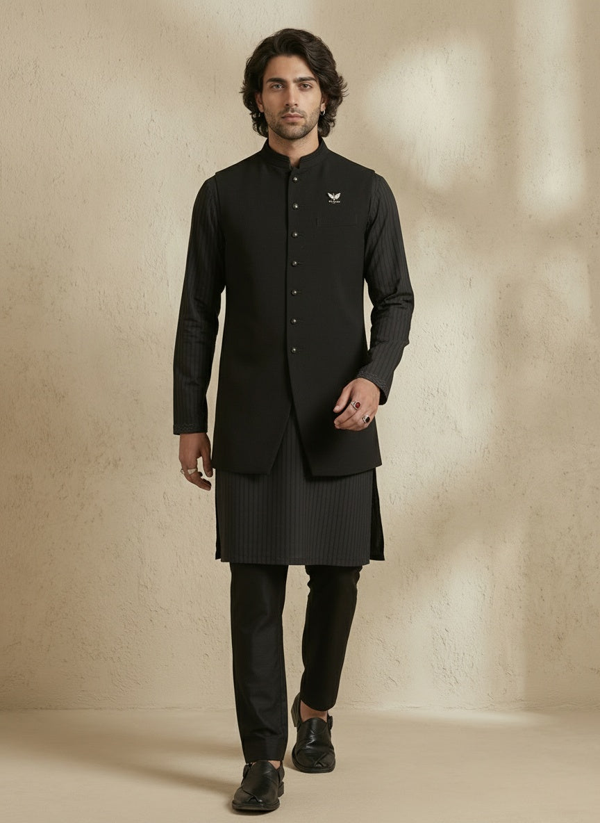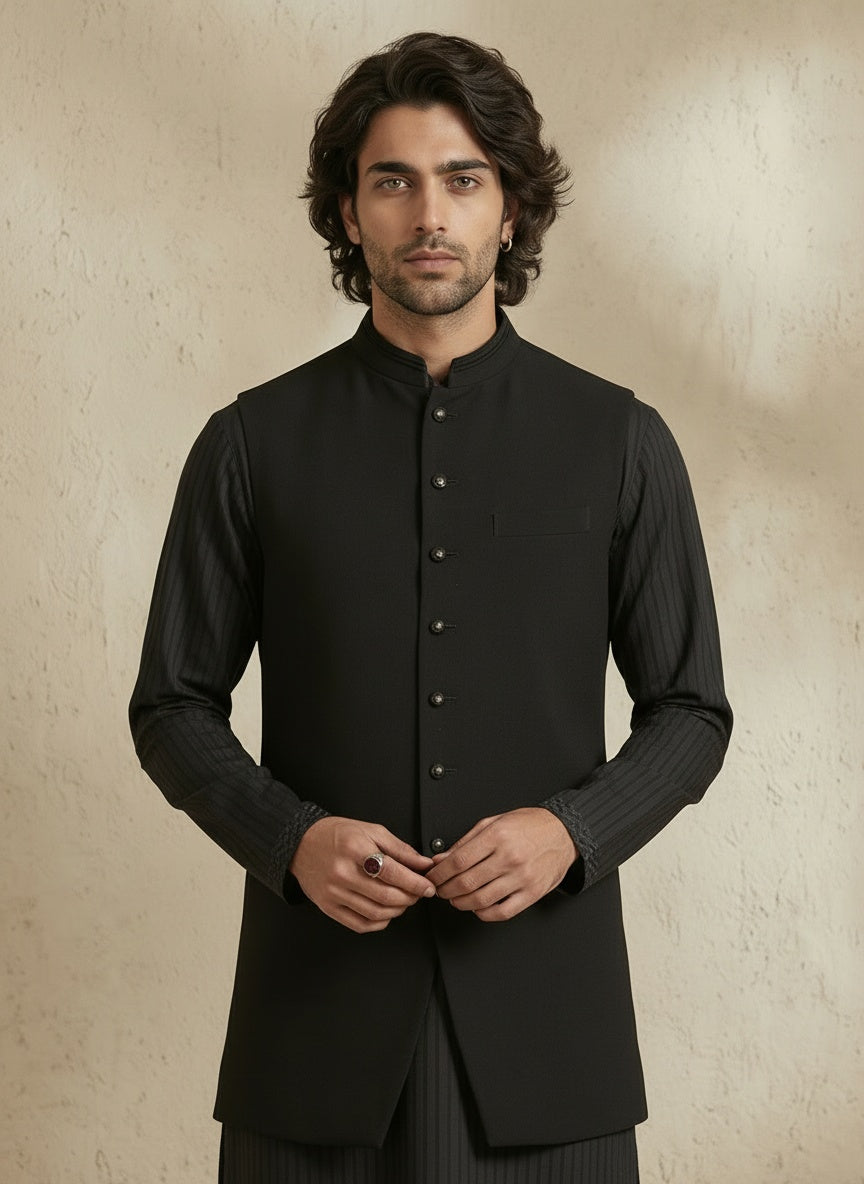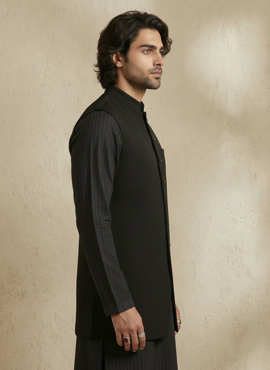 On Model: Black classic sleeveless sherwani jacket