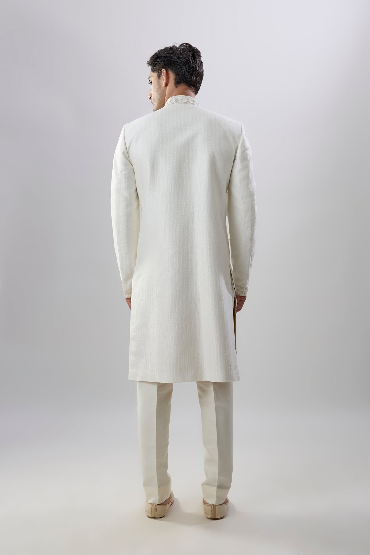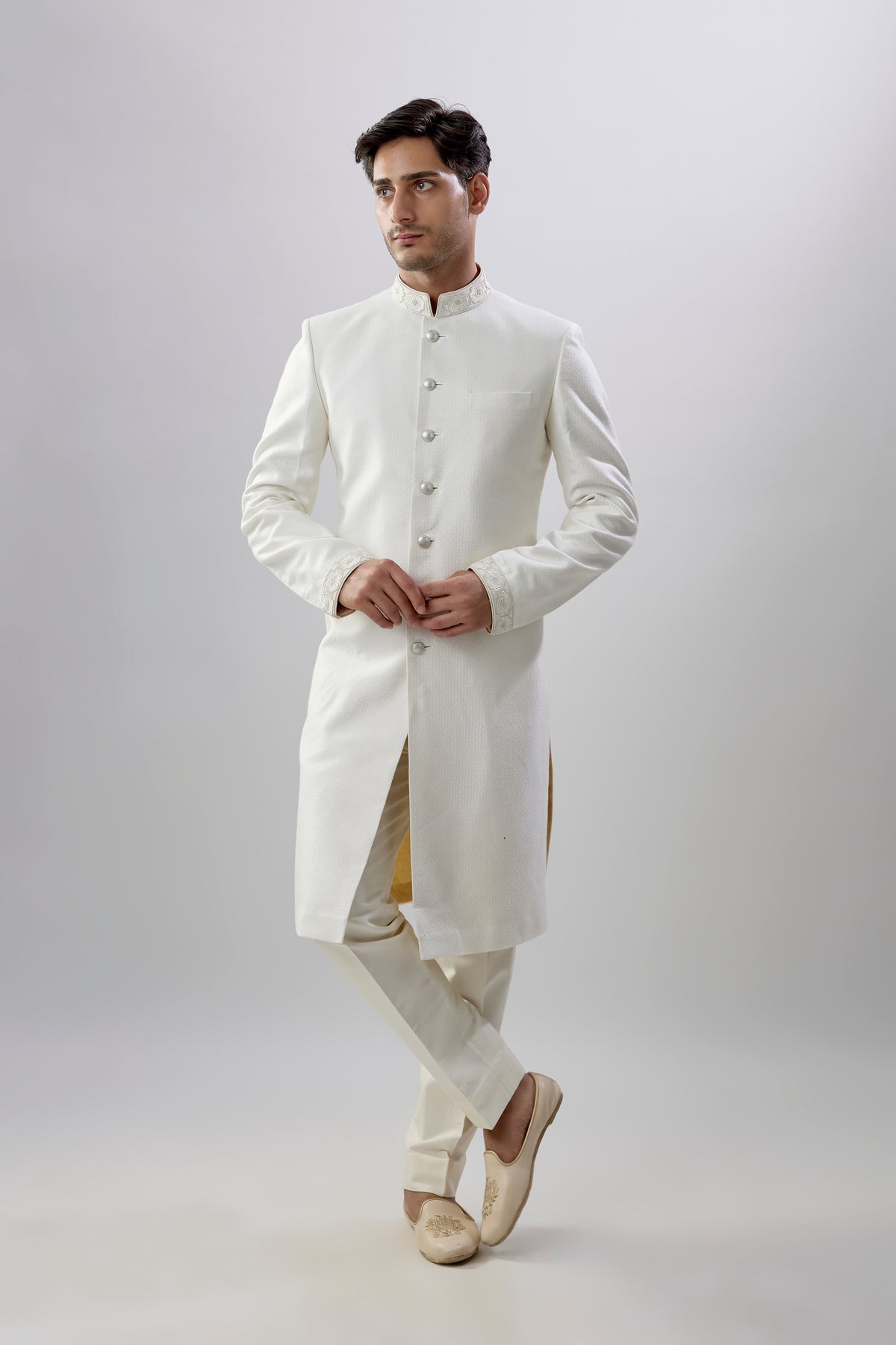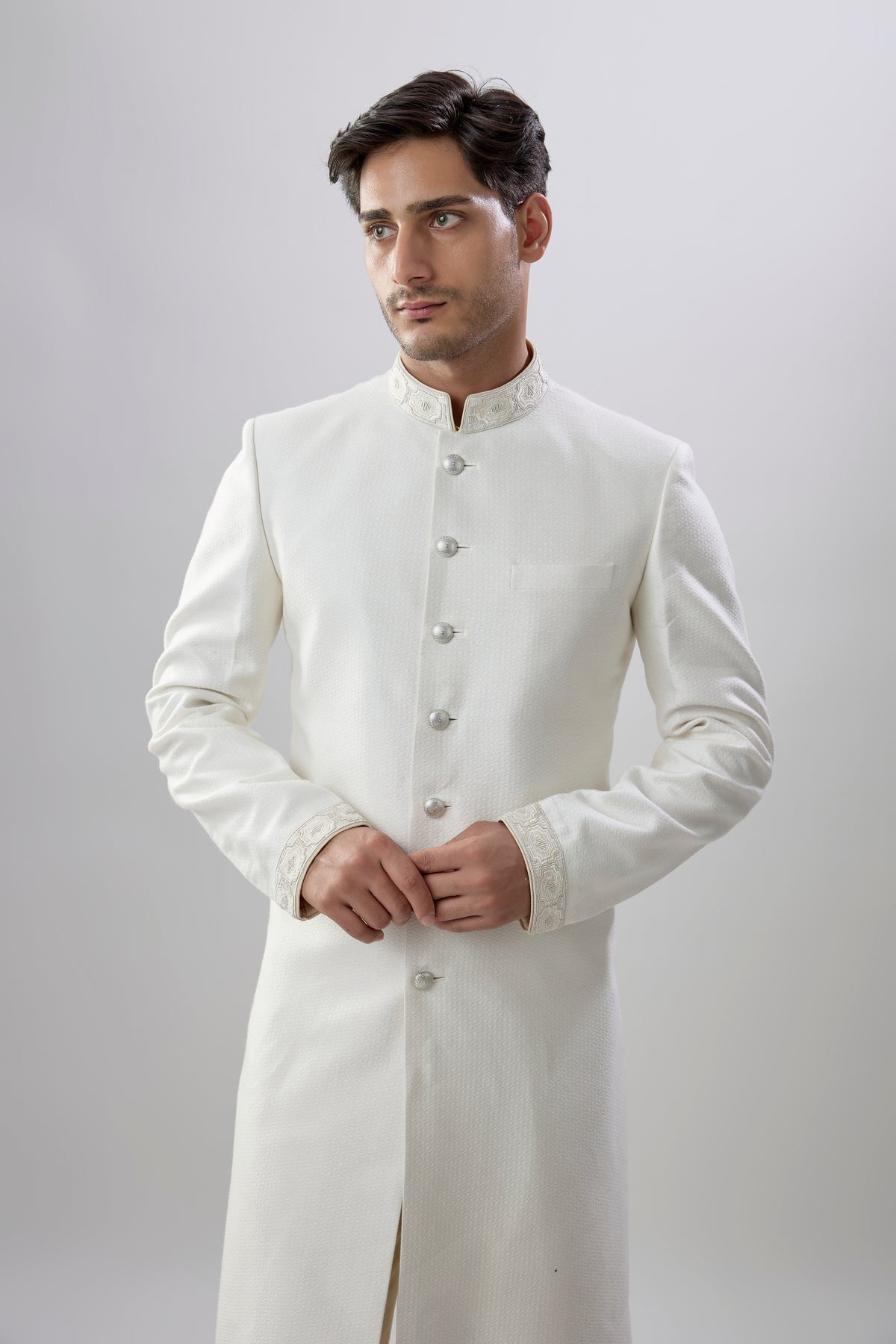 On Model: Off-white celtic embroidered sherwani jacket