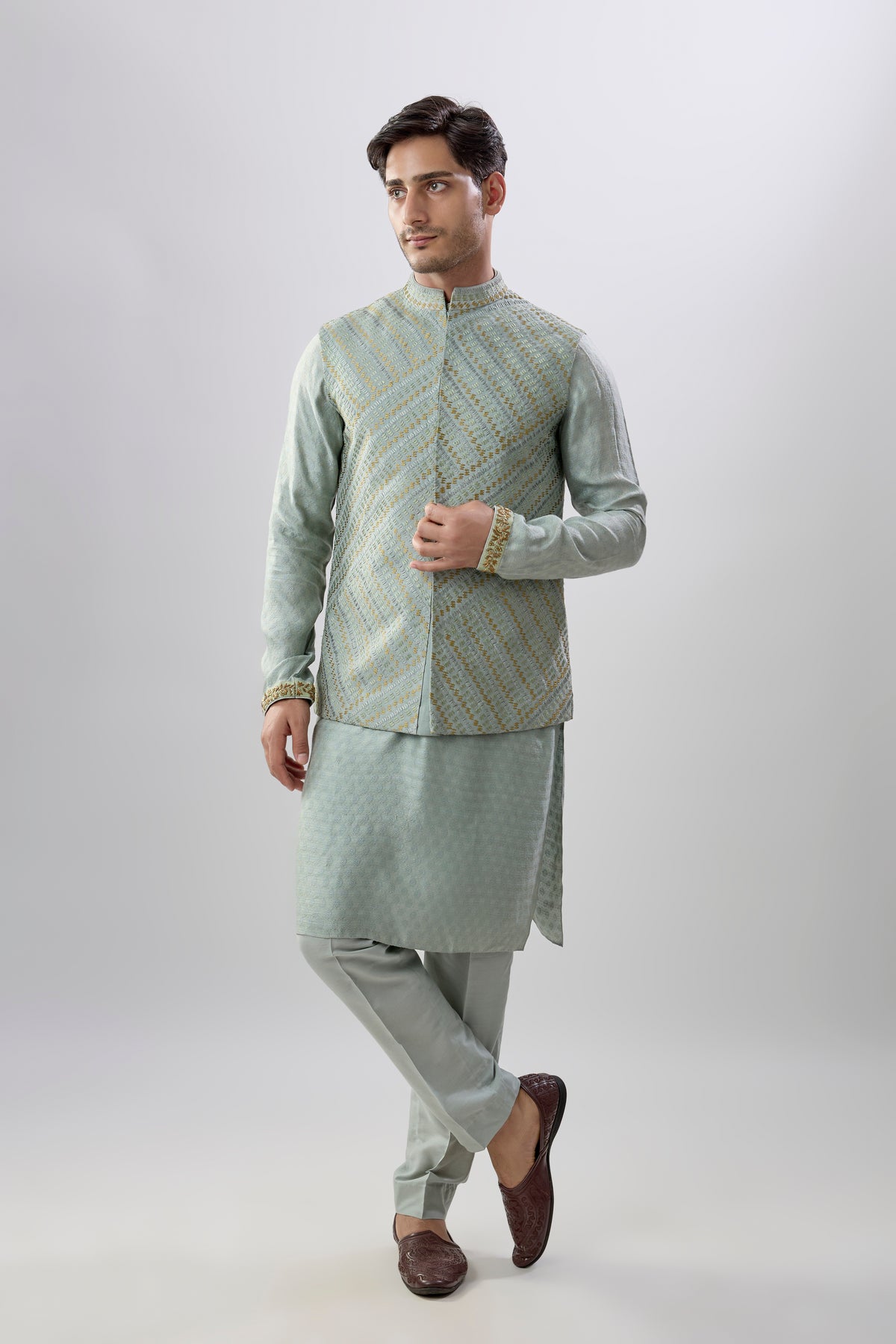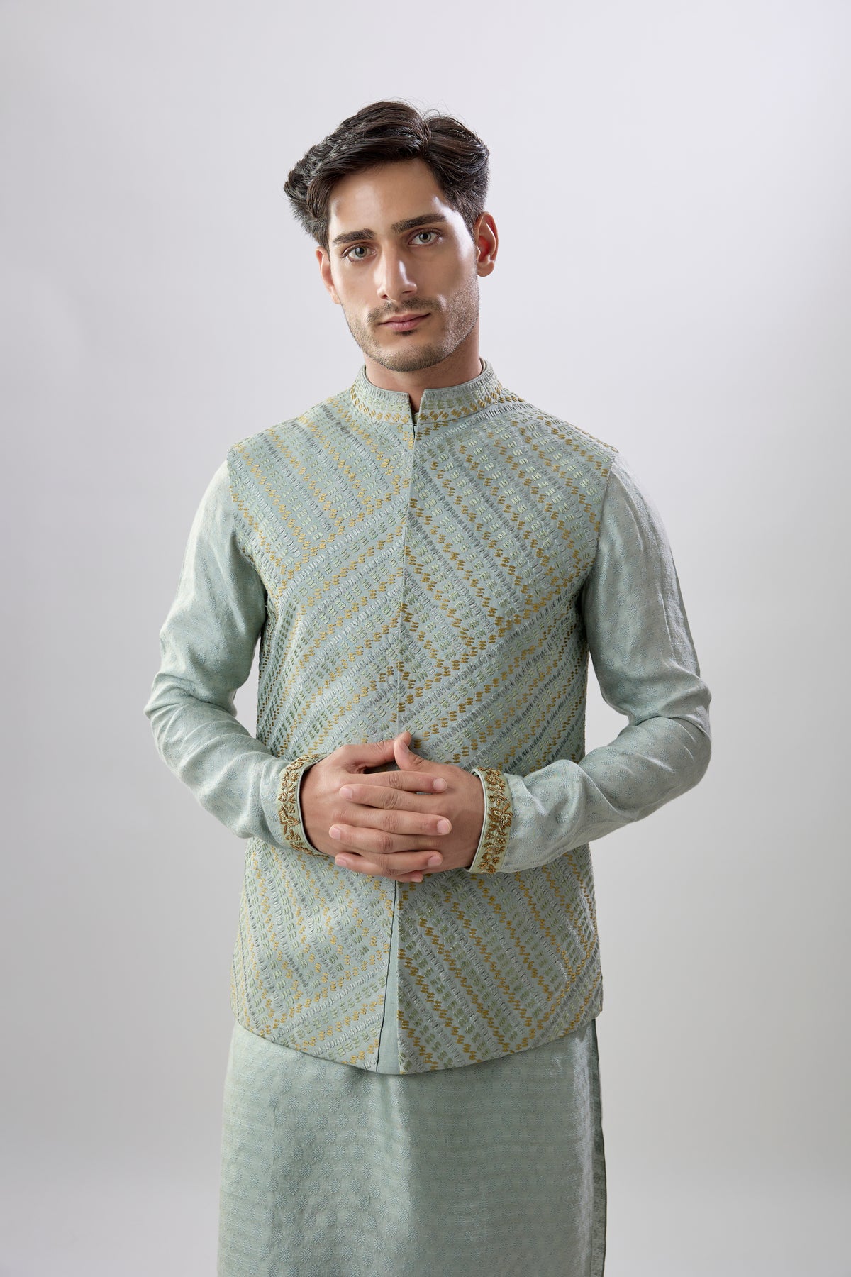 Styled with sage embroidered spotted jacquard kurta set (Not included)