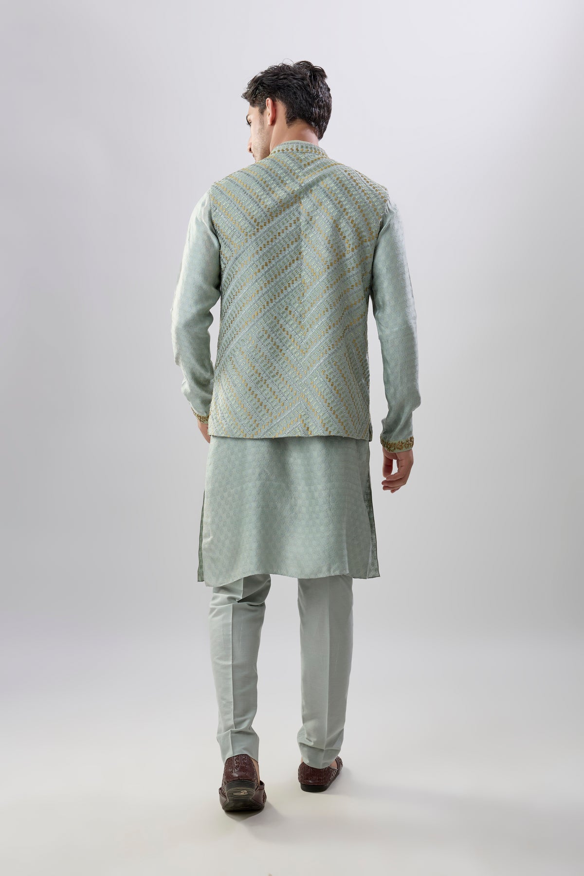 On Model: Slate dashed chevron embroidered bandhi jacket