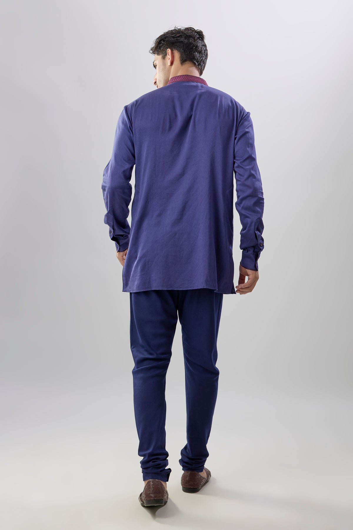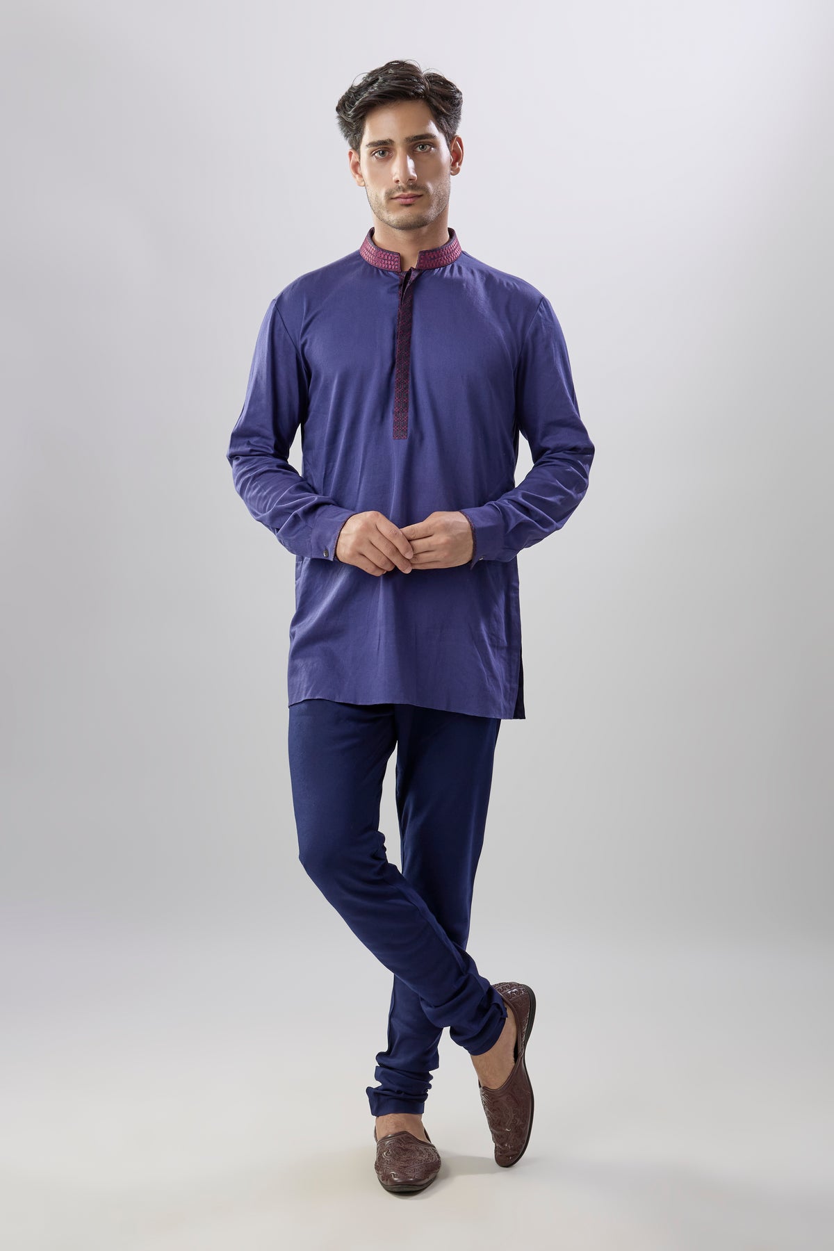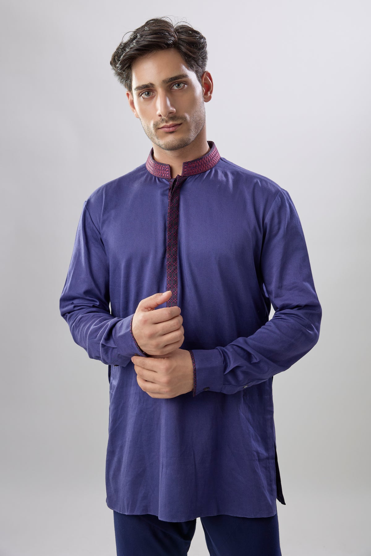 On Model: Royal blue & wine diametric embroidered shirt kurta